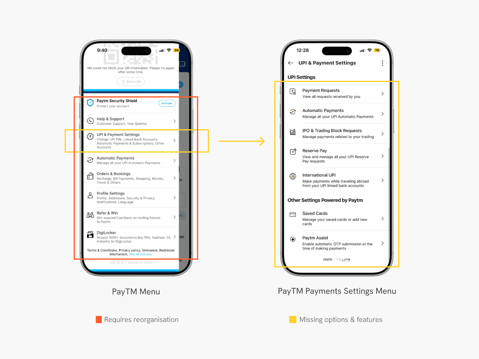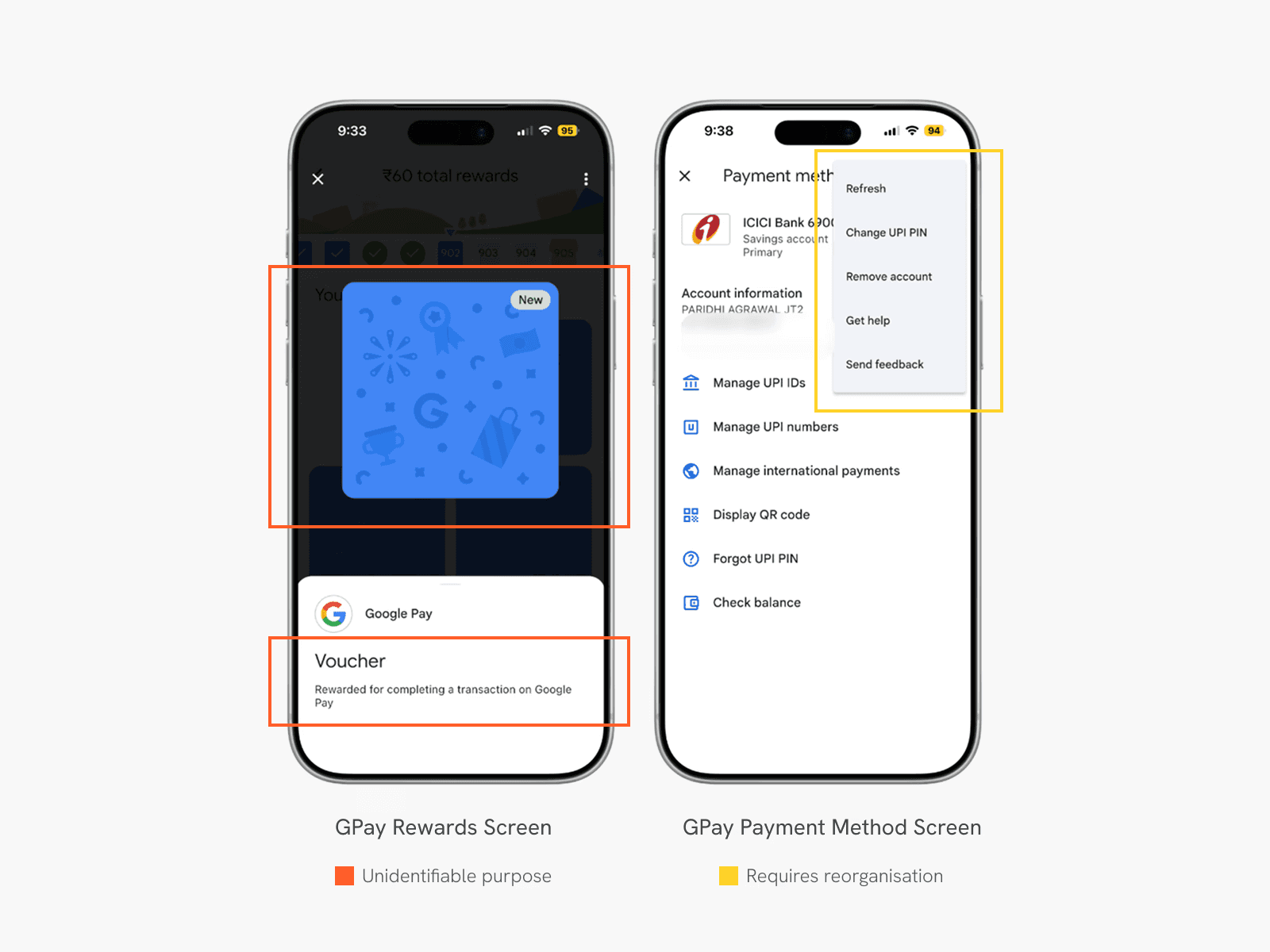 In a study, while trying to change the UPI pin, an issue almost every participant faced was locating the option to do so. They had to navigate through multiple menus to find it, as it was hidden in the secondary Kebab/More menu.