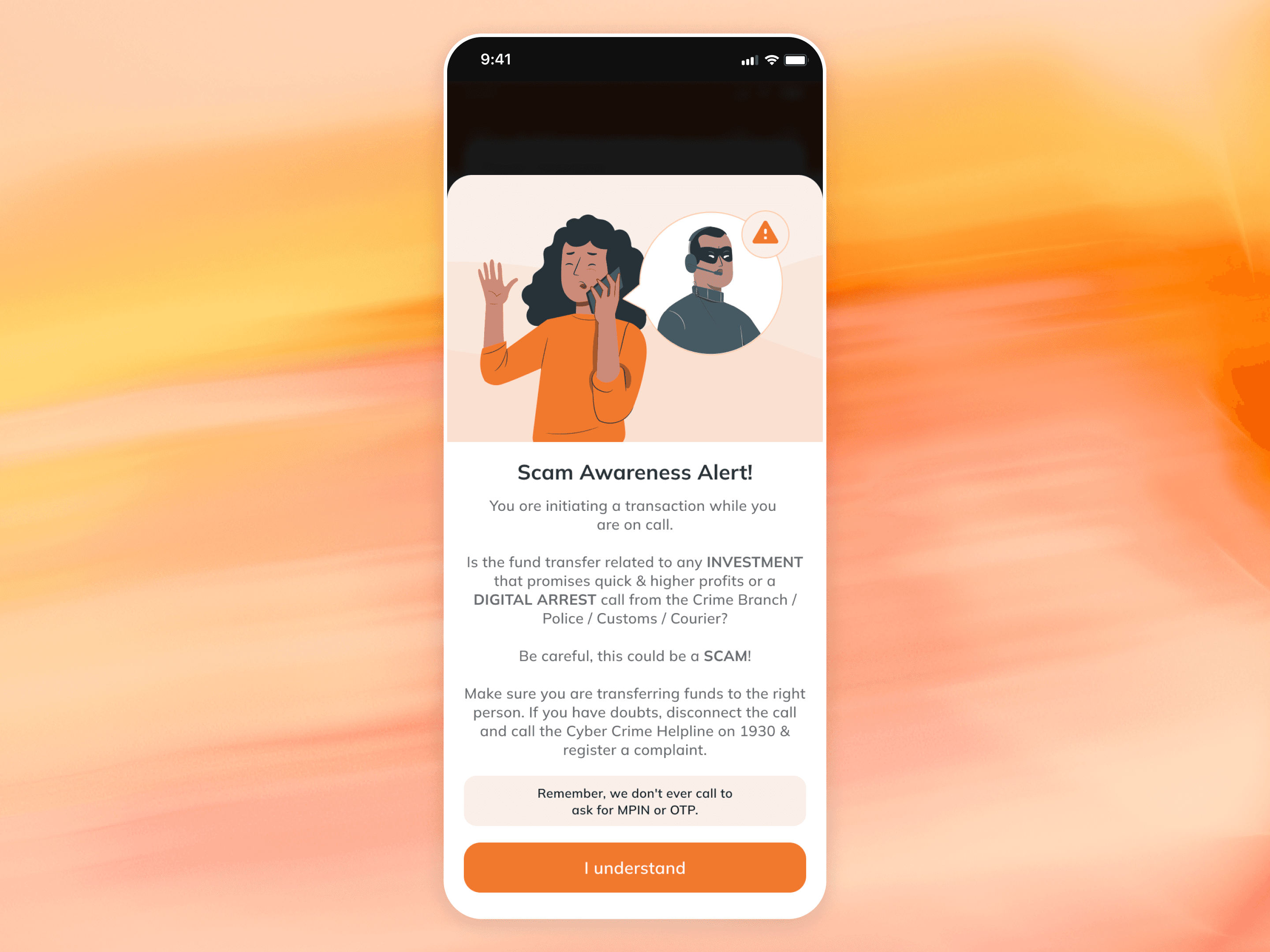 Whenever a user is on a call and tries making a transaction via the ICICI iMobile app, it shows a pop-up to alert them against cyber crimes. It's a protective element that builds trust and keeps users coming back to the secure app.