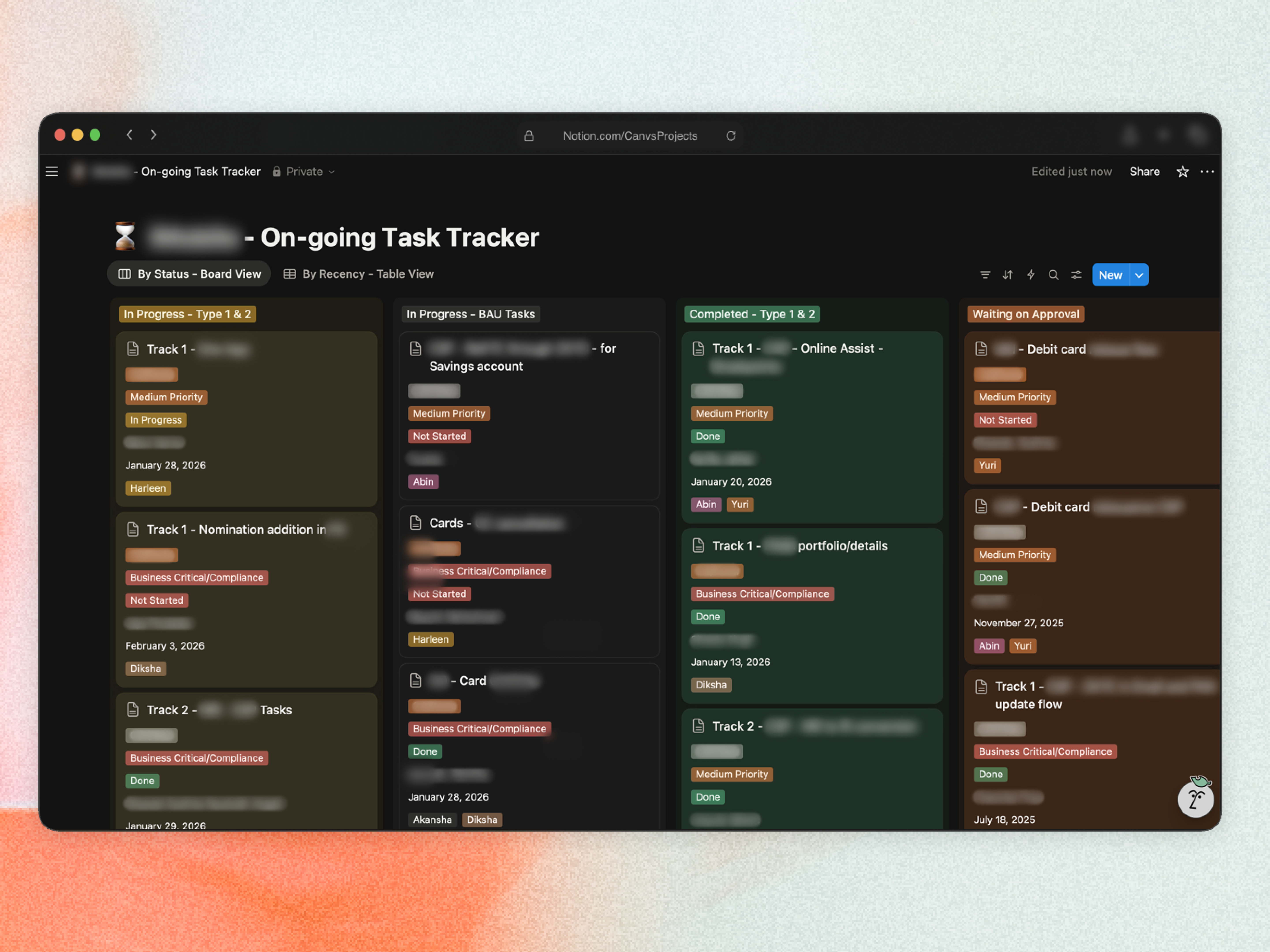 There's an ongoing task tracker for parallel projects and asks with client POCs mentioned, so that DMs can maintain oversight over resource allocation and time-lining.